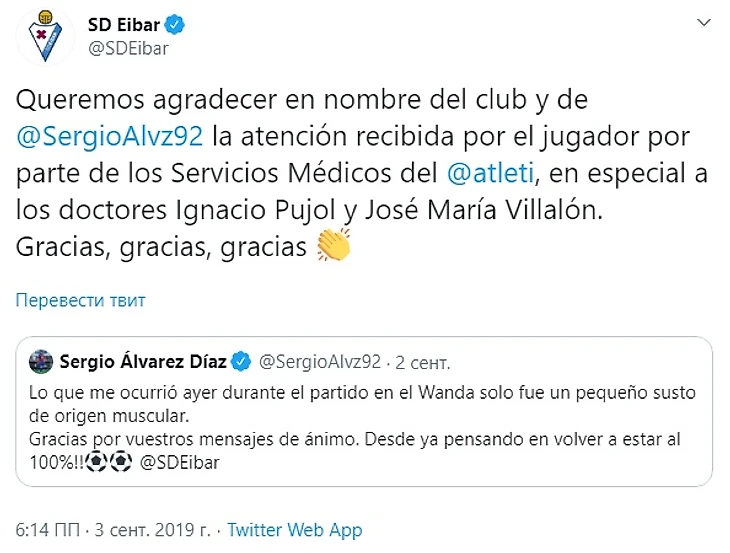 «Эйбар» в твиттере поблагодарил врачей «Атлетико». Они оказали первую помощь игроку с подозрением на сердечный приступ