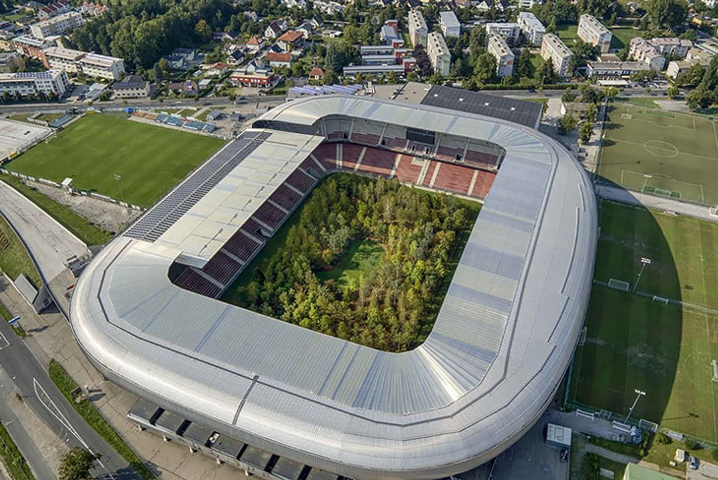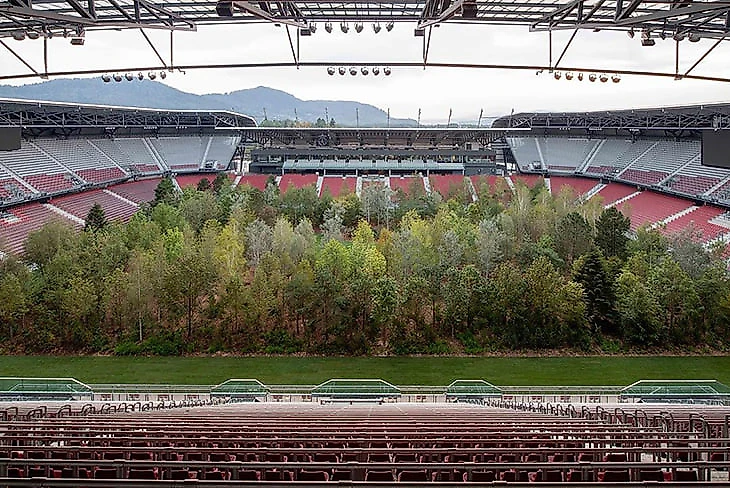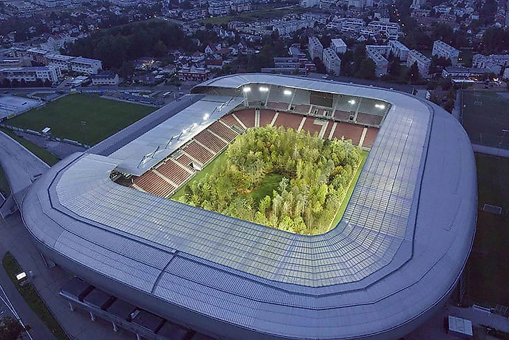 «Этот стадион – один из самых современных в Австрии, я увидел в этом дополнительное преимущество для проекта, – уточняет Литтманн. – Получилось создать контраст: с одной стороны все, сделанное человеком из стали, стекла и бетона, с другой – живой лес, настоящая природа.