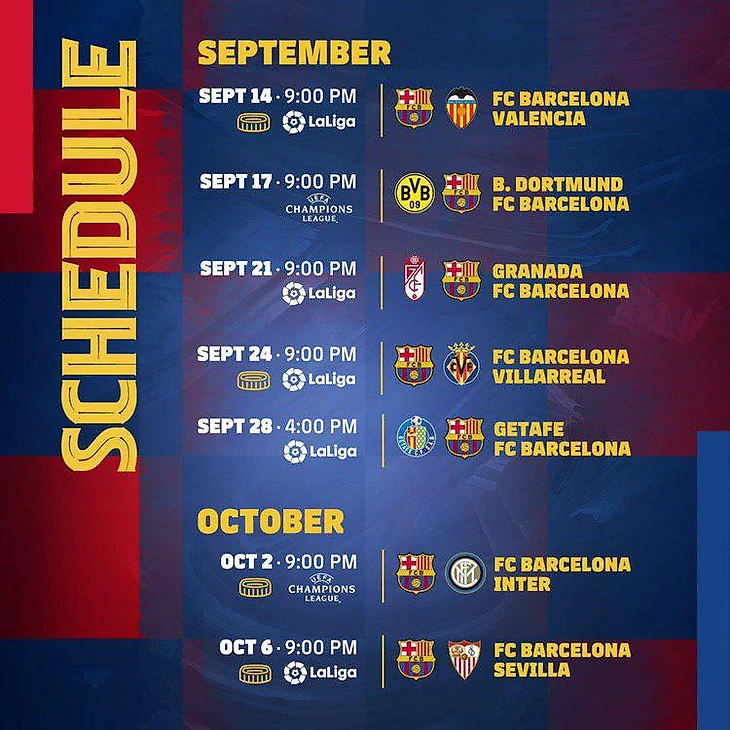 "Барселона" проведет в общей сложности семь матчей в течение сентября и начала октября, когда клубный футбол вновь возьмет верх над играми национальных сборных. Из этих семи матчей — пять в Ла Лиге и два в Лиге чемпионов. "Сине-гранатовым" предстоит встретиться с такими командами, как "Валенсия", "Боруссия, Дортмунд", "Интер" и "Севилья".