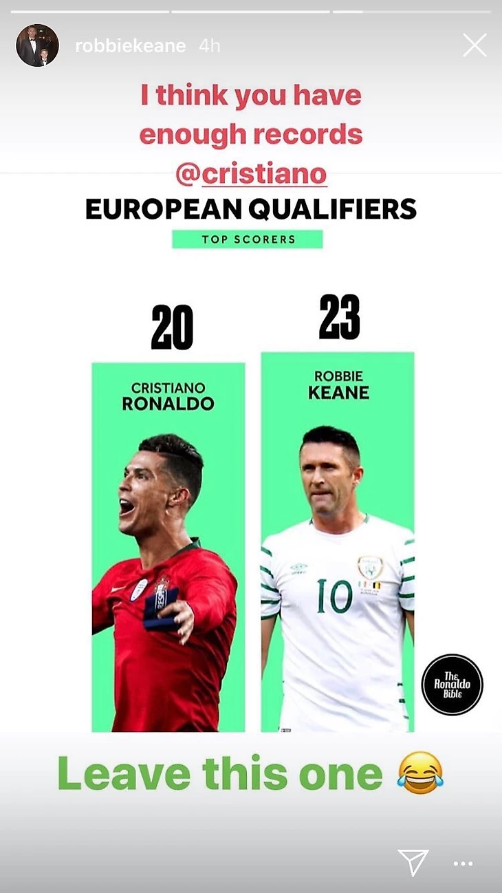 Накануне матча Португалии с Литвой эк-игрок сборной Ирландии Робби Кин в своем Instagram-аккаунте попросил Криштиану Роналду не бить его рекорд по голам за сборные в квалификациях на Евро.