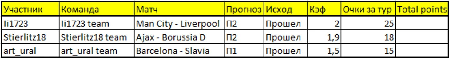 Теперь суть: Каждый участник перед матчем, выбирает одну ставку, порог кэфа отсутствует, можно теоретически взять кэф хоть 1000! Но, важное но! Когда все участники определились со своими коэффициентами, идет тур, по итогам которого, все зашедшие ставки засчитываются и составляется таблица, в которой, тот кто забрал лучший прошедший коэффициент занимает первую строчку и получает 25 очков, второе место 18 и т.д. все как по систему ГП Ф1. Таблица примерно такая: