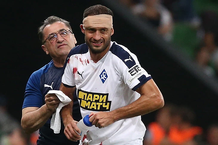 • У Гацкана случился еще один казус: помимо игры рукой ему в одном из столкновений разбили голову. Майка полузащитника была вся в крови, поэтому доигрывал он в футболке без номера.