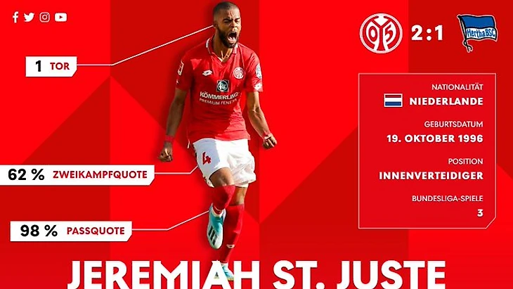 «Майнц» осторожничал меньше, но реализовать момент им удалось только под конец тайма, когда на 40-й минуте Кунде получил слишком много пространства с правого фланга. Немного удачи хозяев и Квайсон открывает счёт.