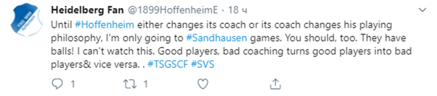 До #Hoffenheim либо меняет своего тренера, либо его тренер меняет свою игровую философию, я только собираюсь #Sandhausen игры. Тебе тоже следует. У них есть шары! Я не могу смотреть это Хорошие игроки, плохая тренировка превращает хороших игроков в плохих игроков и наоборот.