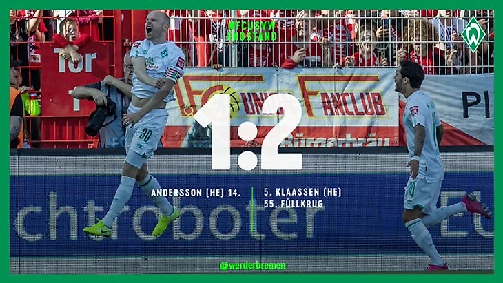 Во втором тайме бременцы ещё более яро пошли в атаку, а по итогу на 54-й минуте всё-таки заработали свой второй пенальти. Однако во второй раз Классен забить с 11 метров не смог. Но уже на следующей минуте «Вердер» всё-таки повёл в счёте, когда с углового забил Фюллькруг. Ответить «Униону» уже не удалось. Под конец тайма сначала Суботич, а затем и Шахин получили по второй жёлтой карточке и были удалены с поля. Игра с высочайшим градусом, в которой судья бегал (до телевизора) чуть ли не больше, чем команды, закончилась боевой победой бременцев. Берлинцам же на сей раз сенсацию сотворить не удалось.