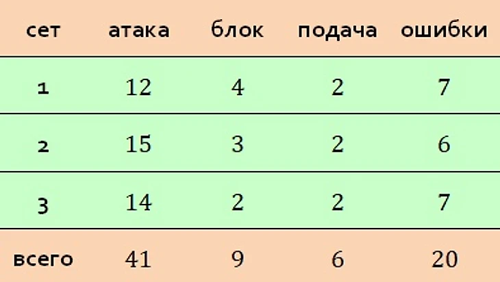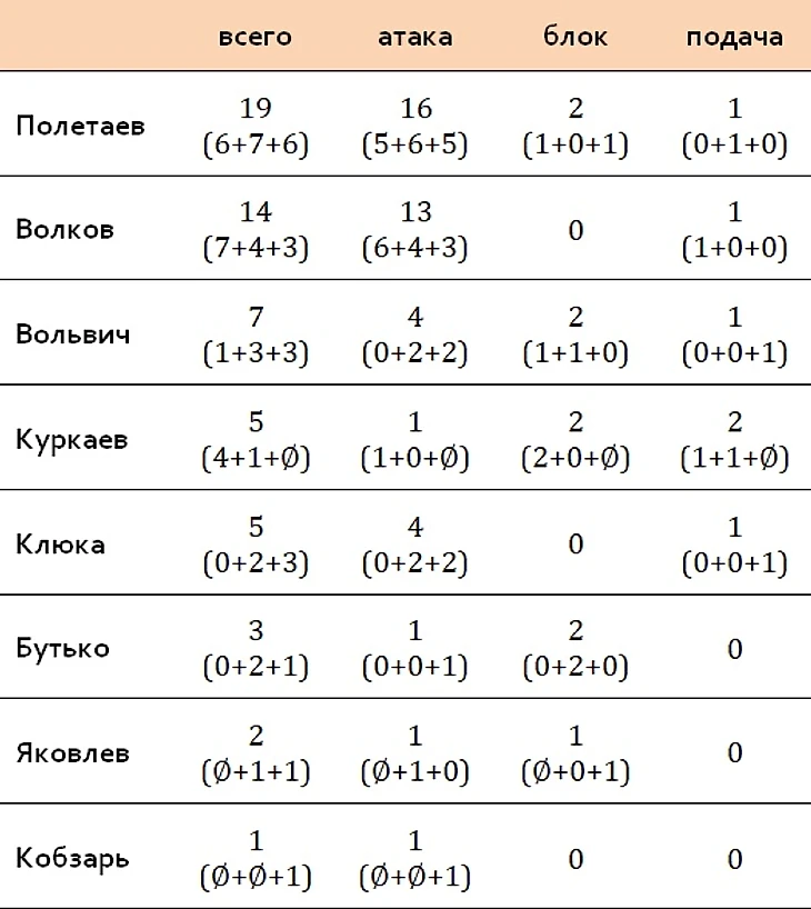 Хороший Полетаев в двойке и хороший Волков в четвёрке — это, конечно, хорошо, но хотелось бы большего разнообразия, а то ведь в иной день у любого из них может и не попереть. Мои циферки отличаются от официальных на один пункт как раз в атаке: по ссылке она приписана Волкову, у меня — Клюке. Но здесь своим глазам я доверяю больше. Уж Клюку-то от Волкова я отличу. Кто хочет, может проверить: Егор забивал во 2-й партии при счёте 3-4 и 13-16, в 3-й партии при счёте 0-1 и 11-12. Но вообще об атаке потом.