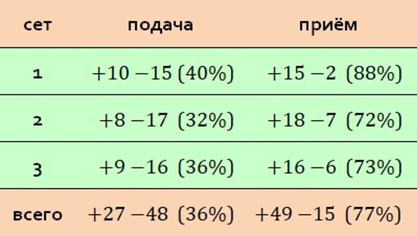В первом сете наши циферки образцово-показательные, потом Россия традиционно разбазаривала часть очков на приёме, но выиграла достаточно брейковых мячей (правда, во второй партии на своей подаче мы взяли меньше трети, то есть опустились за сакраментальную черту — ну, вот и получили игру на балансе).