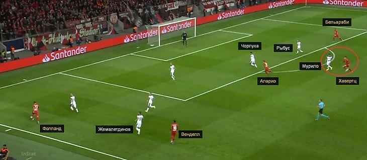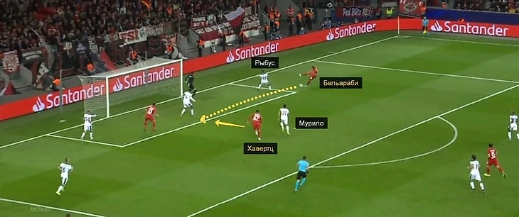 На 49-й минуте случился вообще самый опасный момент «Байера» в матче. В этой атаке Жемалетдинов упустил Венделла еще в середине поля (и не помешал бразильцу продвинуться в финальную треть), Игнатьев не накрыл подачу Фолланда, а Рыбус – вовремя не сместился к Бельараби и не помешал Кариму сыграть в одно касание. Мелкие ошибки игроков «Локо» выстроились в цепочку, но даже они не привели бы к опасности, если бы Мурило доиграл по Хавертцу.
