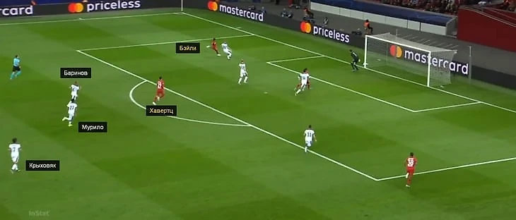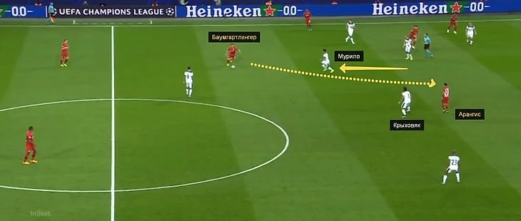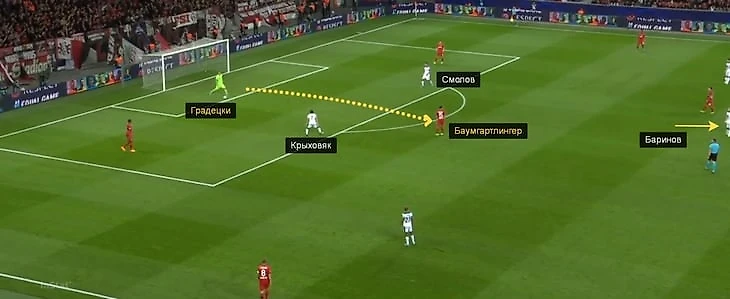 Единственная атака «Байера» с ударом за первые 10 минут получилась именно после такого паса: Баумгартлингер нашел Арангиса. При этом Мурило выдвинулся на Баумгартлингера, а недоработал Крыховяк, проспавший момент передачи.