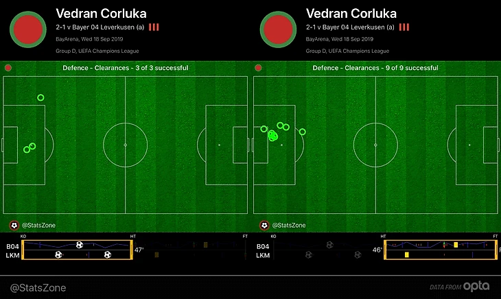 По данным Opta, Чорлука вступил только в 3 верховых единоборства – совсем не сходится с визуальными впечатлениями. Все просто: игра головой Ведрана после бесконечных кроссов «Байера» чаще всего считалась как вынос. У него их 12 (лучший результат матча) – и огромная разница между таймами.