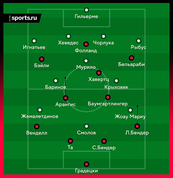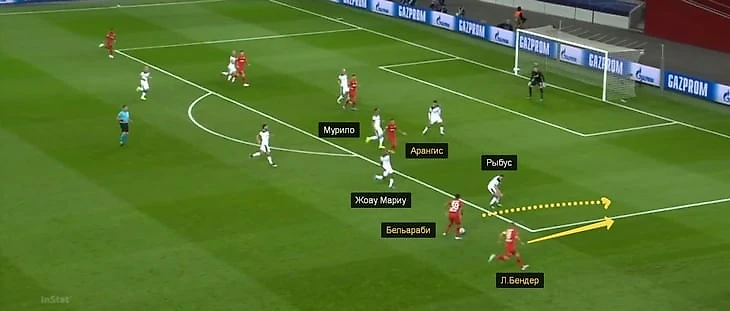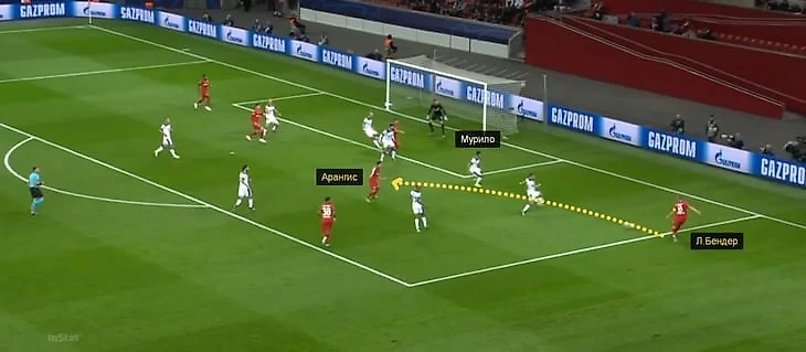 Ларс Бендер сыграл здорово: покатил чуть назад, а не простреливал параллельно воротам. Но в этом микроэпизоде еще качественнее сыграл Арангис: чилиец сделал два шага назад, вбегая в штрафную с Мурило в момент передачи Бельараби на Ларса Бендера, и оказался совершенно один.