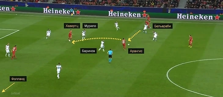 Мурило ошибался и дальше: например, на 61-й минуте не успел перехватить передачу Градецки рукой на Хавертца, из-за чего «Байер» выбежал 3 в 4. Вряд ли уместны серьезные претензии к бразильцу (первый матч в Лиге чемпионов, на новой позиции, против соперника, который любит нагружать опорную зону), но после перерыва его игру точно нельзя назвать очень удачной.