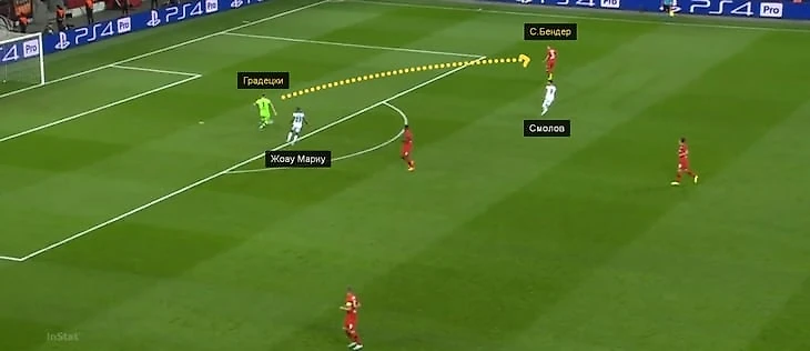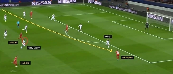 Бельараби из-за позиции Жоау Мариу спокойно отдал передачу под забегание Ларса Бендера – Рыбус уже не мог помочь.