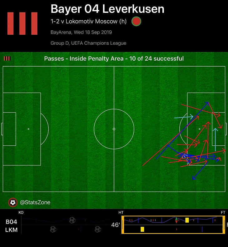 Выход Аларио полностью изменил стиль «Байера» в атаке – немцы свалились на навесы. Разница между двумя таймами колоссальна: до перерыва команда Боса сделала 9 кроссов, после – 27. В первом тайме Бельараби выполнил только 2 подачи, во втором – 13.