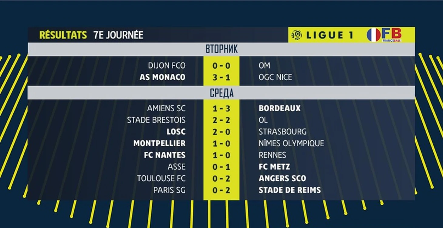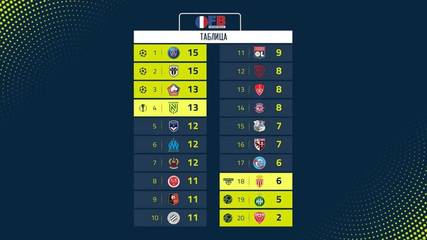 ПСЖ пока ещё первый, но с парижанами поравнялся «Анже», а следом идут «Лилль» и «Нант», отстающих от лидеров на 2 очка. Далее высокая плотность, а на дне компанию полумёртвому последние несколько сезонов «Дижону» составляют «Монако» и «Сент-Этьен».