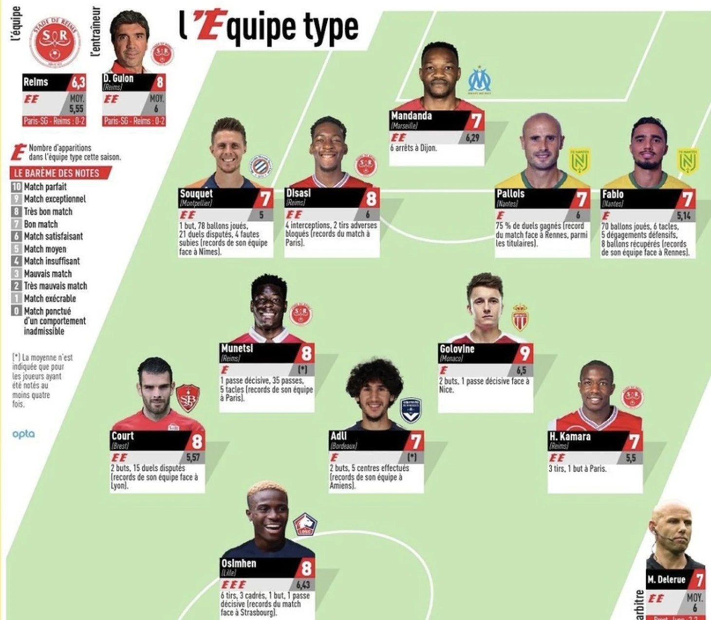 Издание L'Equipe включило в символическую сборную трёх победителей Парижа, спасшего от поражения «Марсель» Стива Манданда, автора победного гола в дерби с «Нимом» Арно Суке, двух защитников «Нанта», показавших себя в дерби с «Ренном», а также зажёгших Александра Головина (2+1), Ясина Адли (2+0), Виктора Осимена (1+1) и Йоанна Курта (2+0).