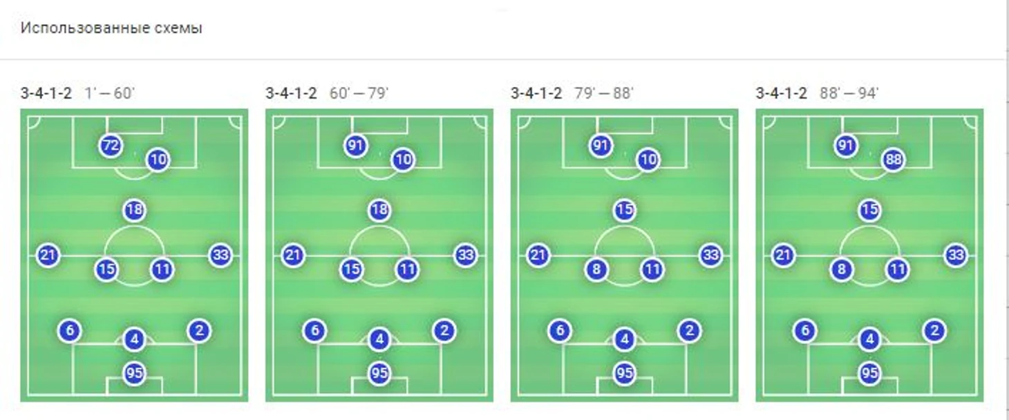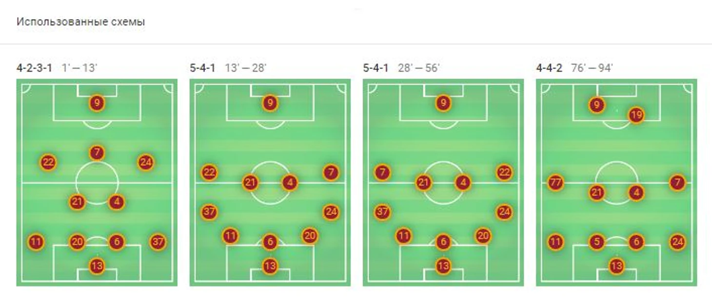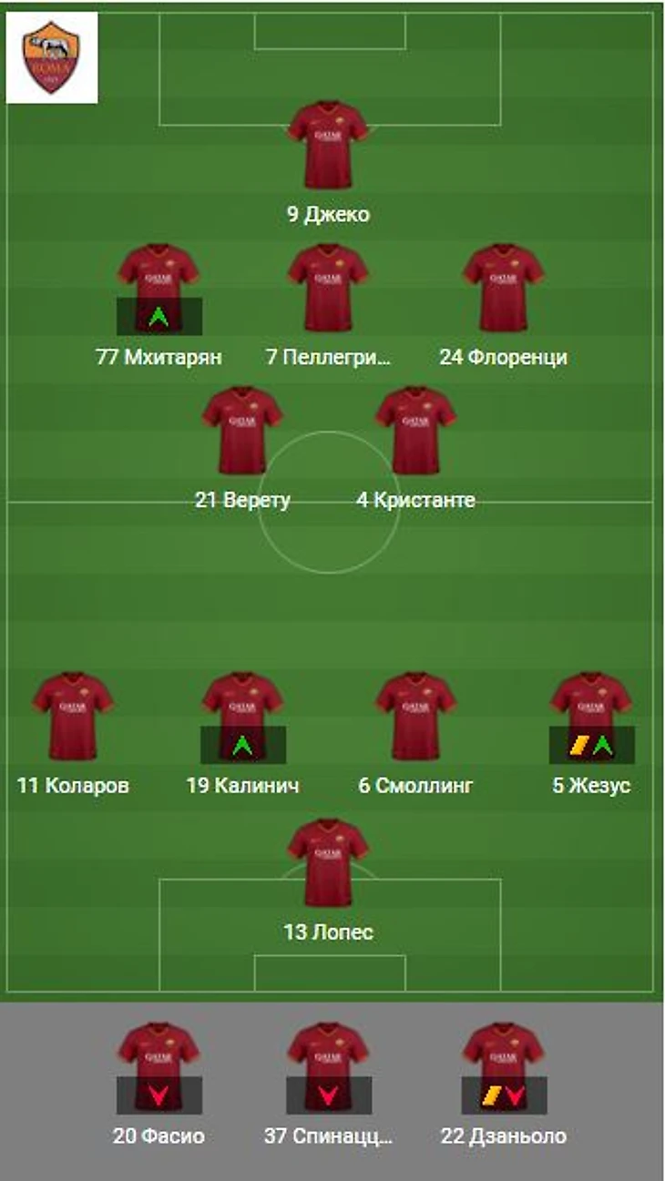 На 76-й минуте Фасио покидает поле, а выходит Калинич, который отправляется на место второго нападающего. Таким образом, с этой минуты и до конца встречи «Рома» играли по схеме 4-4-2.