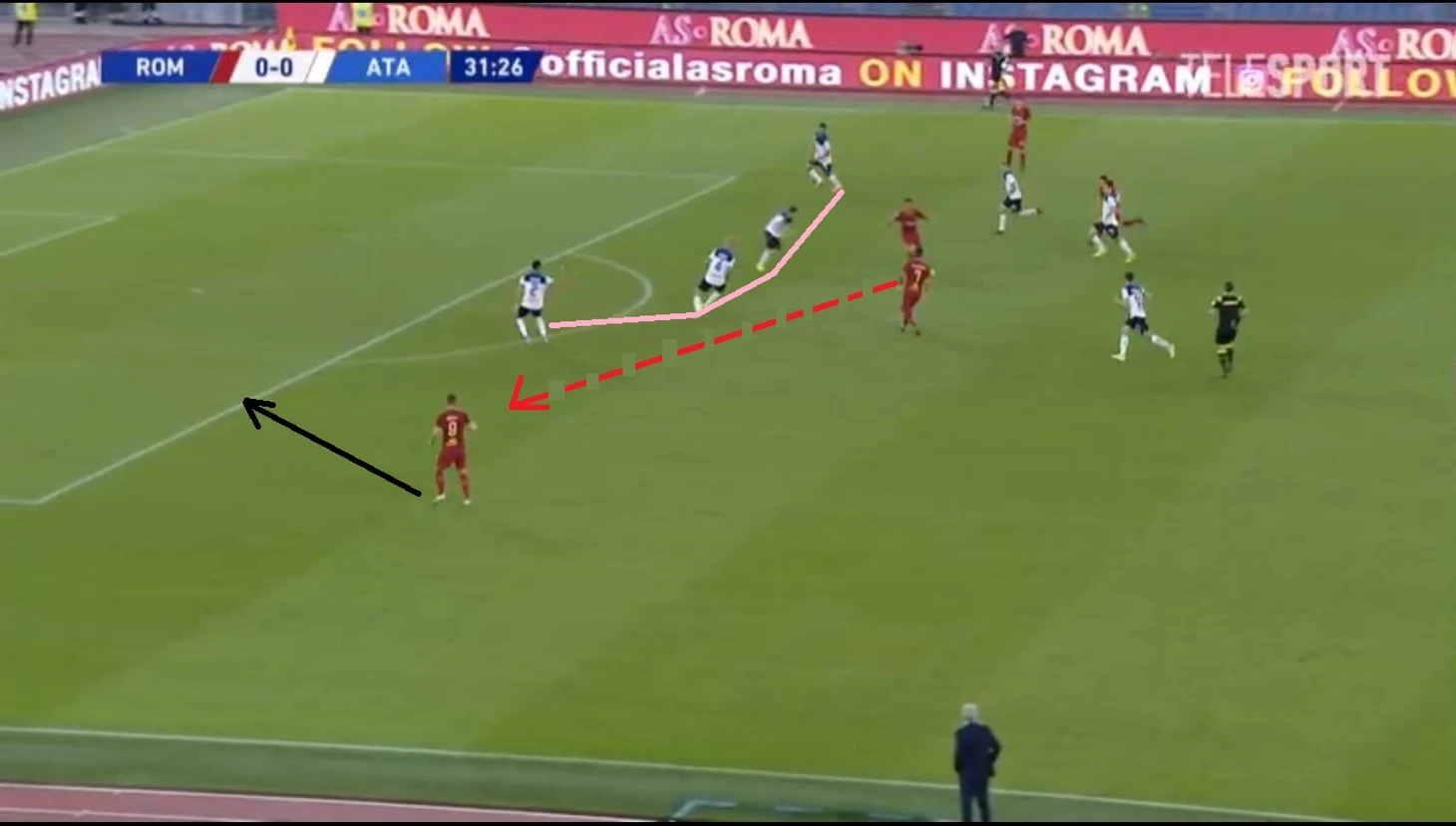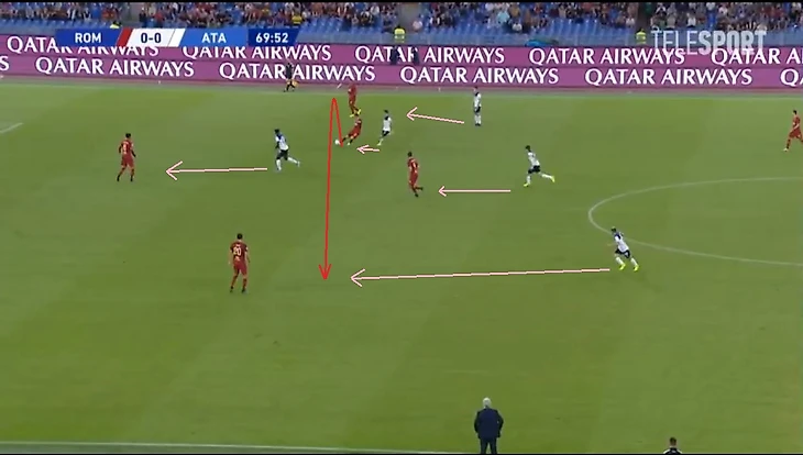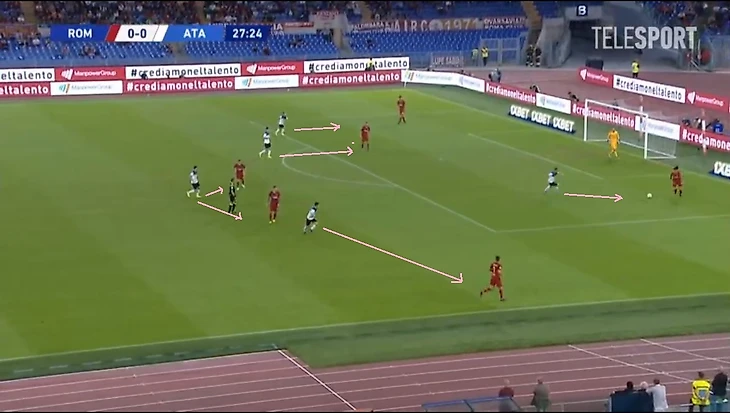 Однако на 59-й минуте римляне громко «постучали в дверь». Долгожданный и удачный выход из-под контрпессинга «Аталанты» состоялся. Фасио протащив мяч, отдает на Кристанте, который отправляет его дальше на Пеллегрини, тот в одно касание вырезает на Дзаньолу и выводит практически один на один с голкиперов. Произошло это в результате разрыва между тройкой центральных защитников. Джеко увел за собой Кьера, а Паломино не прочитал эпизод и задержался ниже соперника.