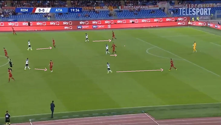 «Рома» практически отказалась от высокого прессинга. Подопечные Фонсеки использовали средний блок, выстраиваясь в плотные ряды 5-4-1 или 5-3-2. Это, в свою очередь, практически зацементировало вторую и первую трети поля от проникающих передач низом.