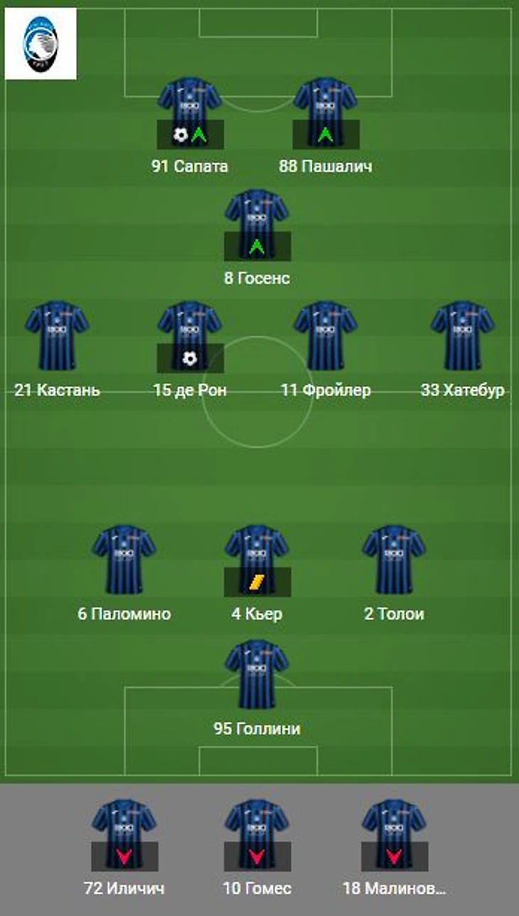 Далее, на 60-й минуте, замена Иличича на Сапату по позиции. А на 60-й минуте Мхитарян меняет Дзаньоло.