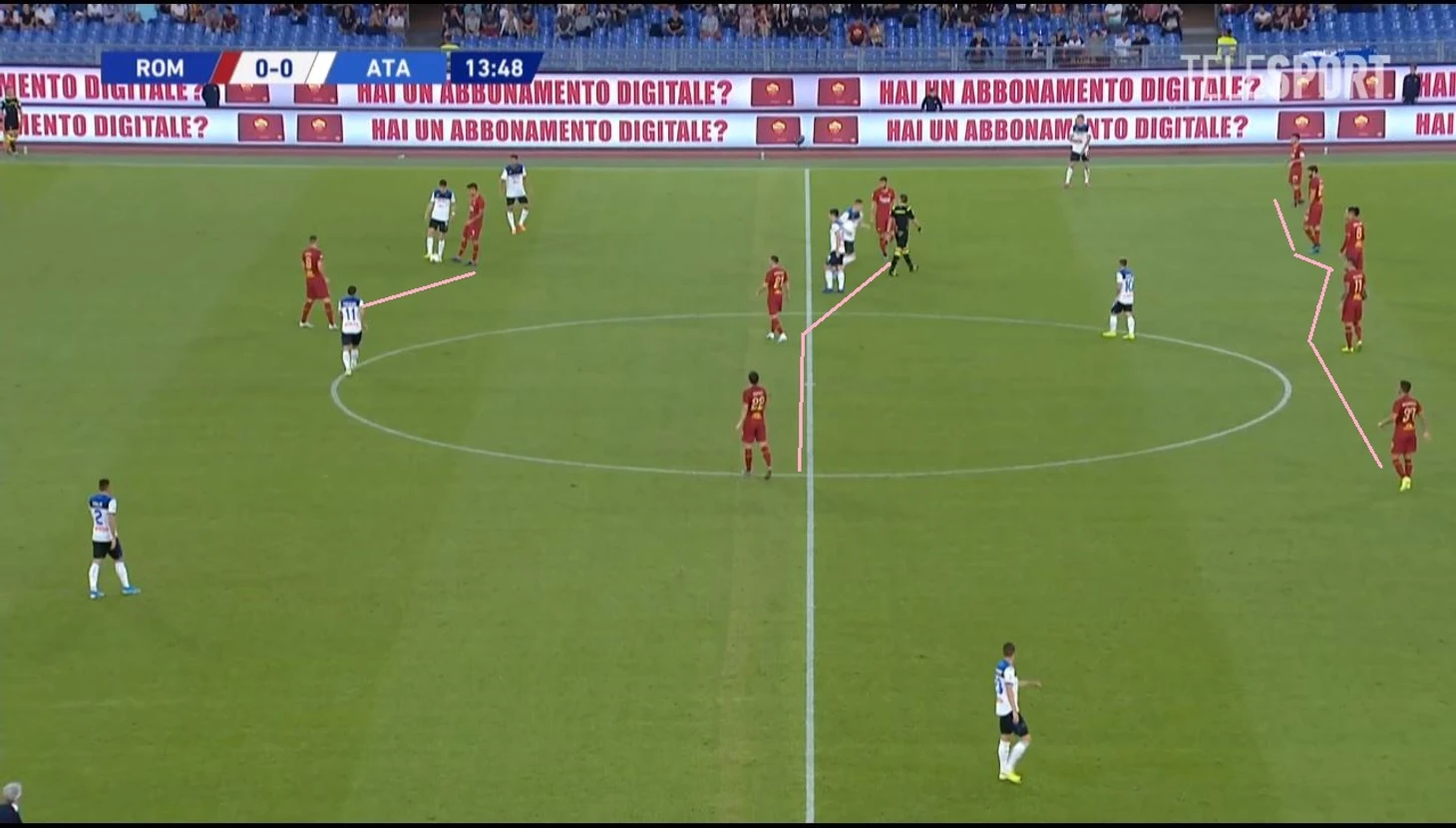 Если схему «Аталанты» можно было предугадать, поскольку больше 75 % игрового времени «оробичи» проводят по схеме в 3 защитника, то выбор «Ромы» был не столь очевидным, поскольку они чаще используют 4-4-2, либо 4-2-3-1. В итоге римляне вышли на поле также в три центральных защитника, во главе которых находился Смоллинг.