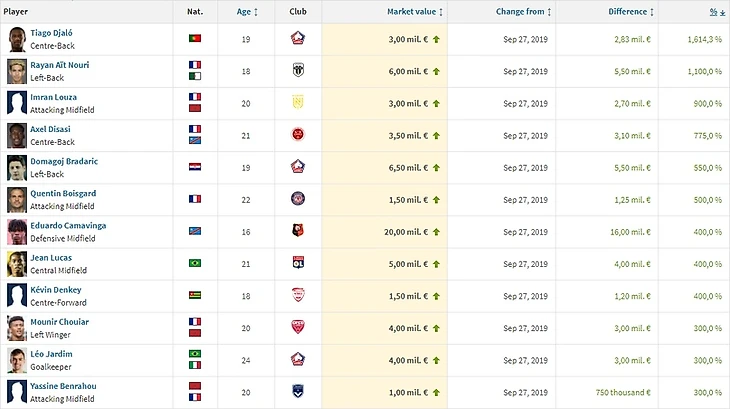 Что касается процентного соотношения роста цены, то возглавляет список 19-летний новичок «Лилля» Тиаго Джало, чья стоимость выросла на 1643,3 %. Также больше, чем на 1000% вырос в цене левый защитник «Анже» Райан Аит Нури, который в этом сезоне сыграл в 7 матчах и сделал 2 голевые передачи — цена увеличилась с 0,5 миллиона евро до 6 миллионов евро.