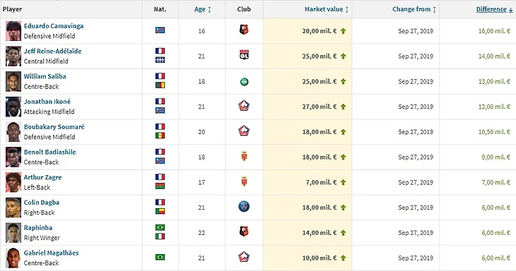 Другие молодые французские таланты также доказали летом, что цены на них будут только расти. 18-летний центральный защитник Вильям Салиба, перешедший из «Сент-Этьена» в «Арсенал» за 30 миллионов евро, но оставшийся в Лиге 1, яркий тому пример — его стоимость с 12 миллионов евро выросла до 25 миллионов евро. Другие яркие представители лиги талантов — защитник «Лилля» Бубакари Сумаре (20 лет/+ 10,5 млн), а также защитники «Монако» Бенуа Бадиашиль (18 лет/+ 9 млн) и Артур Загре (17 лет/+ 7 млн).