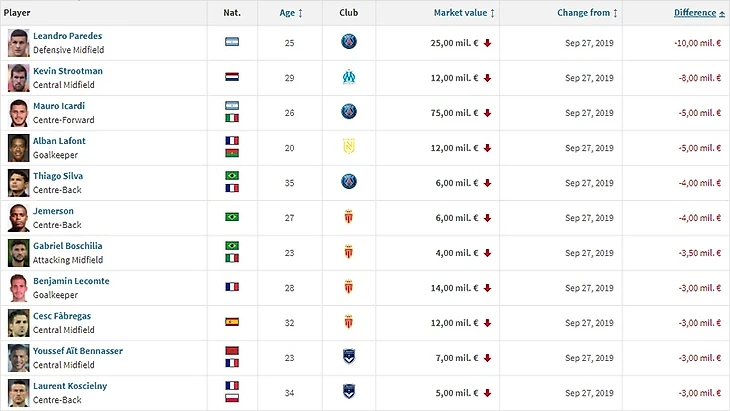 Наравне с Икарди в цене потерял голкипер Албан Лафонт, вернувшийся из Италии во Францию, а на втором месте располагается опорник «Марселя» Кевин Стротман, который с 20 миллионов евро подешевел до 12 миллионов.