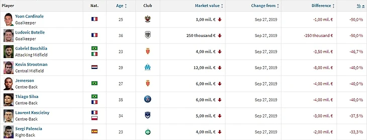 В процентном соотношении, в два раза подешевели некогда надёжные кипера Йоан Кардиналь и Людовик Бютелль. Также в этом списке присутствуют люди из предыдущей таблицы: Бошилья, Строотман, Жемерсон, Силва и Косьельни. Замыкает Топ-8 правый латераль «Сент-Этьена» Серхи Паленсия, потерявший чуть более 30% цены.