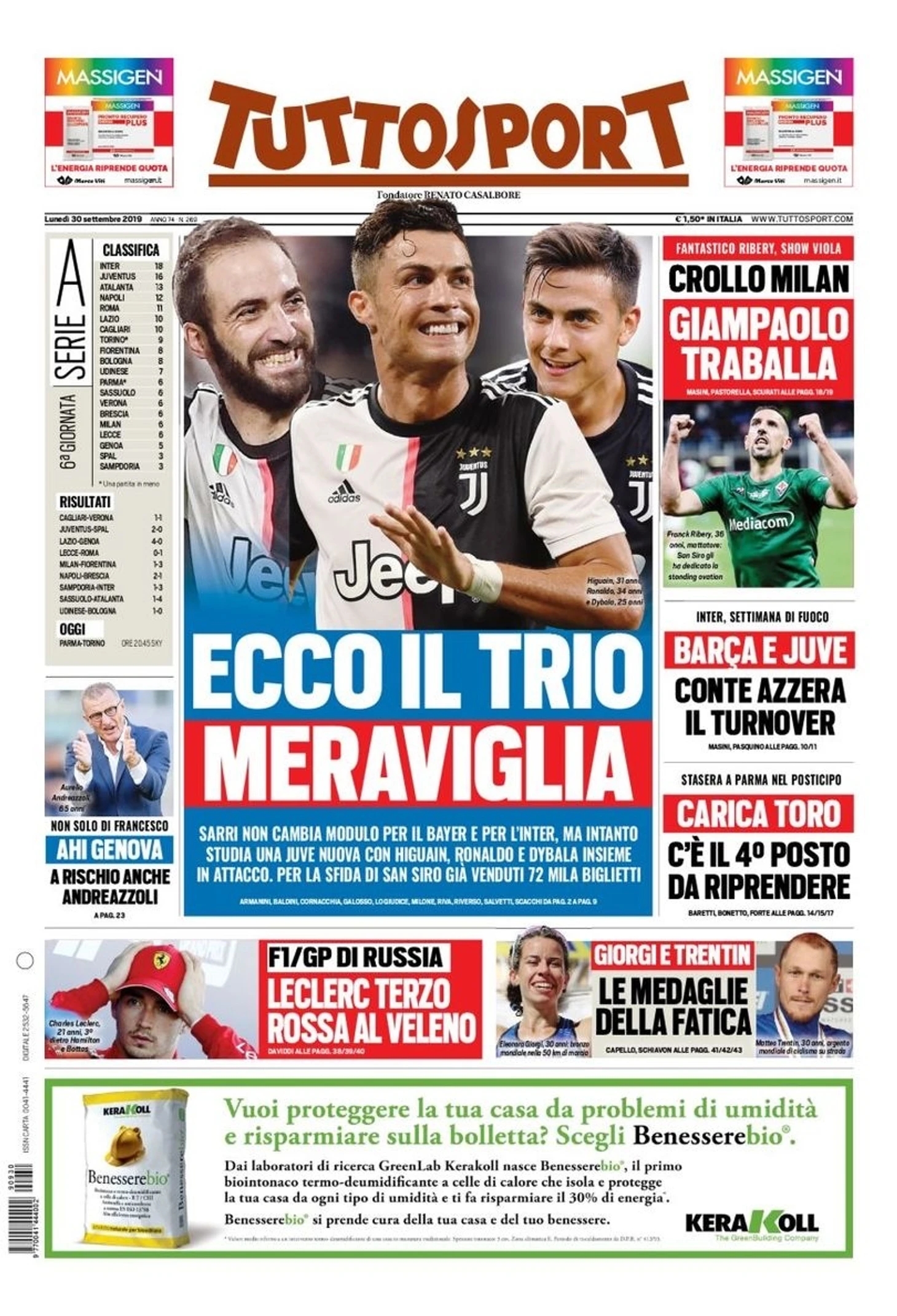 Сарри не меняет модуль на «Байер» и на «Интер», но между тем изучает новый «Юве» с Игуаином, Роналду и Дибалой вместе в атаке. На матч на «Сан Сиро» уже проданы 72 тысячи билетов.