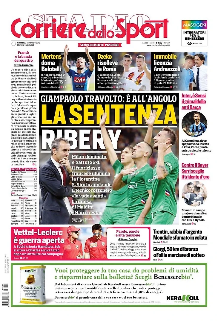 Разворачивается кризис Россонери. Монтелла+Рибери: «Фиорентина» хозяйничает на «Сан Сиро» (3:1). Крах и третье поражение подряд. Болельщики уходят, а Джампаоло? Тренер: «Иду вперёд, верю в мои идеи». Мальдини: «У него есть наше доверие». Но решающей будет схватка с «Дженоа». Проверяются имена Гарсии и Раньери.