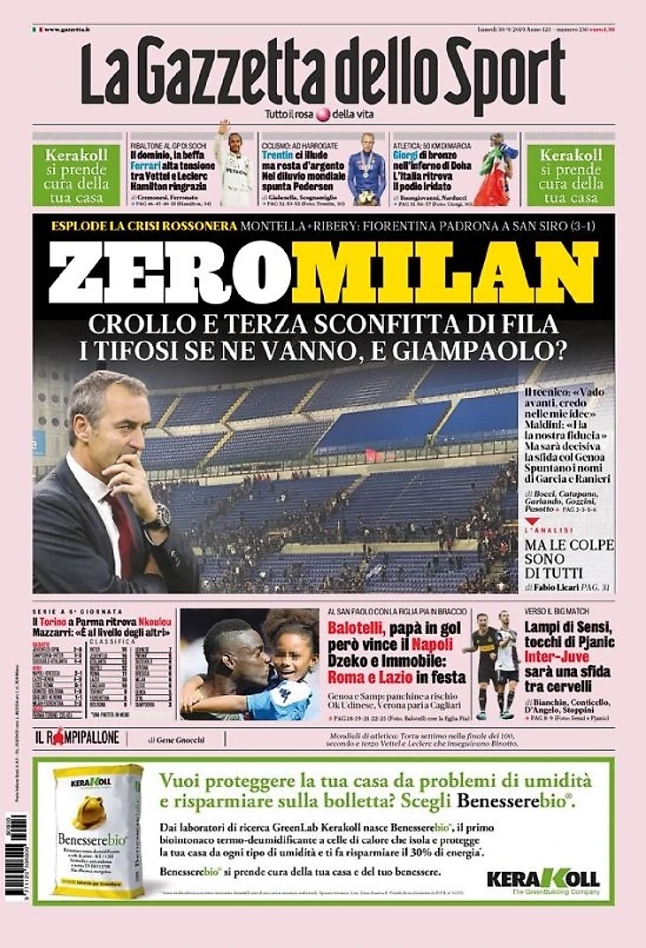 Ноль «Милана». Заголовки Gazzetta, TuttoSport и Corriere за 30 сентября