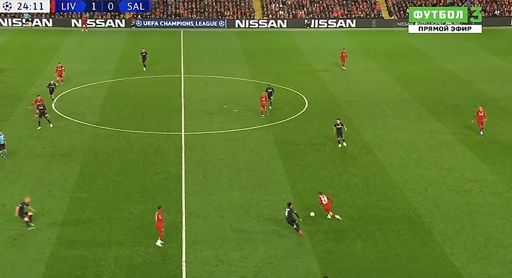 Робертсон отдает пас Хендерсону и устремляется вперед, а Фирмино спокойно оттягивает на себя внимание Кристенсена, сдвигаясь к флангу. Хендерсон отыгрывается с Салахом, который пользуется у защитников повышенным вниманием и разворачивает атаку на Александер-Арнольда.