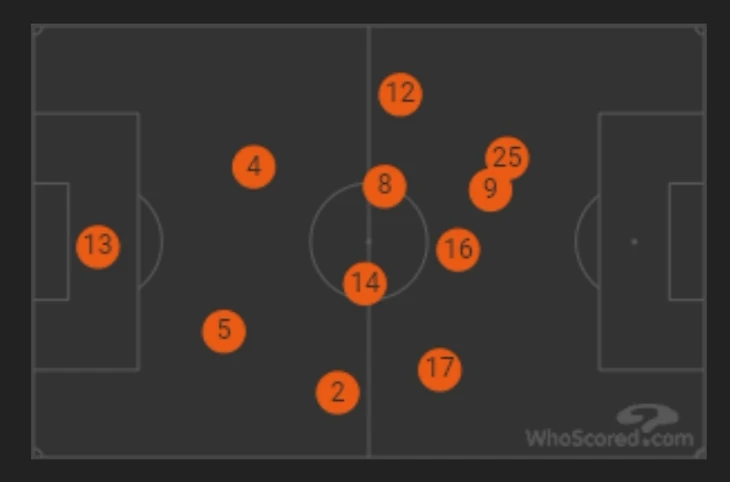 Усредненные позиции игроков Реала в матче с Леванте. Под номером "4" Рамос, под номером "12" Марсело.