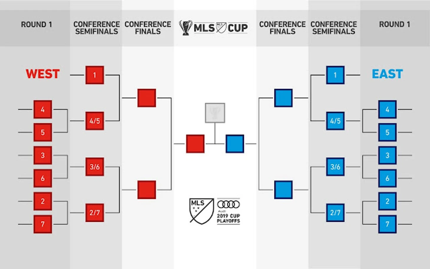 Как видно из схемы к финалу команды западной и восточной конференции пойдут с двух сторон. В первом раунде победители конференций будут отдыхать, 6 матчей состоятся на полях команд, оказавшихся выше в турнирной таблице, и 2ое место будет играть с 7ым, 3ье с 6ым, а 4ое с 5ым.