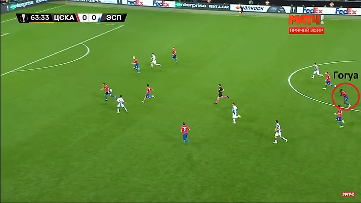 На бумаге звучит неплохо, но вот досада: Гогуа очень давно не играл в четвёрке и очень много бросается в прессинг даже для самого центрального защитника в модуле с 3 игроками центра обороны. Посмотрите на первый пропущенный мяч в игре с "Эспаньолом" - во время голевого удара Седрик находится ближе к центру поля, чем к своим воротам. Ставить его одним из двух центральных защитников в команде с очень сильно клонящимся к атаке крайними защитниками - рискованно. При этом заменить его на Карпова тоже рискованно - хотя возможно, что Ганчаренко пойдёт на это, для того, чтобы иметь на поле игроков центра обороны с разными рабочими ногами.