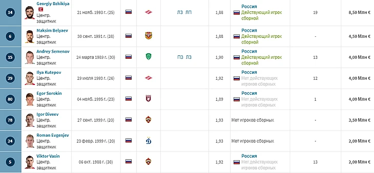 Молодой, центральный защитник с российским паспортом и прекрасным голевым чутьём на стандартах, и это во времена когда в сборной жесточайший дефицит подобных талантов, и если в способностях Георгия Джикии нет причин сомневаться, даже не смотря на проблемы Спартака, то к его напарникам по центру обороны очень большие вопросы, последнее время им является тридцатилетний защитник Ахмата (клуба претендующего выйти в ФНЛ) Андрей Семёнов. Более наглядным смотрится ранжирование игроков данного амплуа по стоимости, популярным футбольным сайтом ориентировочных ценников на игроков.