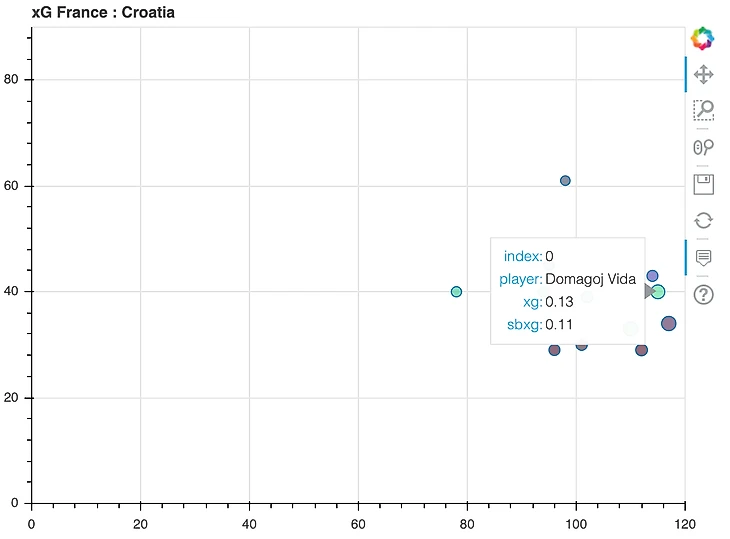 В следующих примерах поле xg - байесовский классификатор, sbxg - xG от StatsBomb: