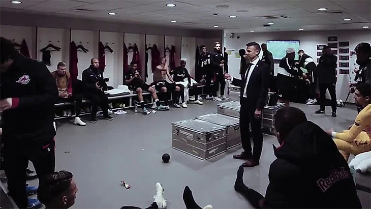 В раздевалке было две камеры: одну я просто установил в углу, со второй пришел в перерыве сам. Съемка в движении – это я с ручной камерой, на видео с угловой слева можно заметить меня. Сразу после матча сотрудники медиаслужбы «Зальцбурга» попросили скинуть им речь Джесси Марша. Пока мы с командой летели из Ливерпуля в Зальцбург, я вырезал этот эпизод и просто склеил видео с двух камер – клуб выложил ролик на своих страницах.