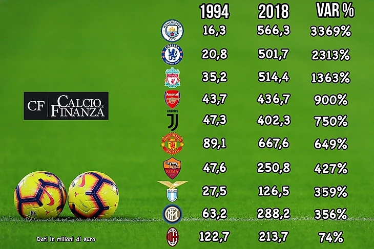 Каким был футбол в экономическом плане в 1994 году? С переводом в евро и инфляции выручка «Интера» выросла до 63,2 млн евро, далее шла "Парма" с 55,9 млн евро, «Рома» 47,5 млн евро, «Ювентус» зарабатывал всего 47,3 миллиона евро и «Лацио» 27,5 миллиона евро. В Англии впереди всех был «Манчестер Юнайтед» (89,1 миллиона евро), а за ним следовали «Арсенал» (43,6), «Ливерпуль» (35,1), «Челси» (20,7) и «Манчестер Сити» (16,3).