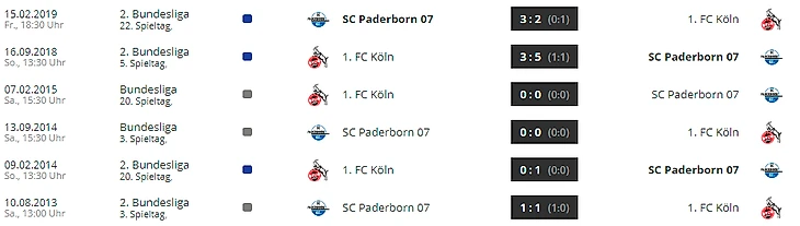 Хотя из этих клубов «Кёльн» закончил прошлый сезон второй Бундеслиги на первом месте с отрывом в шесть очков, именно «Падерборн» выиграл обе встречи команд. Суммарно в них было забито 13 мячей. Тем не менее, обе их встречи в первой Бундеслиге в сезоне 2014/15 закончились со счётом 0:0.