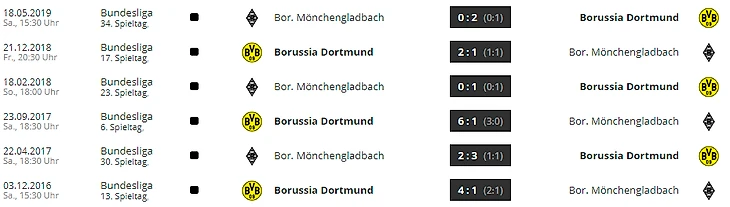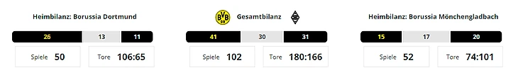 «Дортмунд» выиграл восемь последних матчей против «Гладбаха», что является самой длинной из их текущих победных серий. Дома они выиграли 12 из 13 последних встреч, включая последние пять.