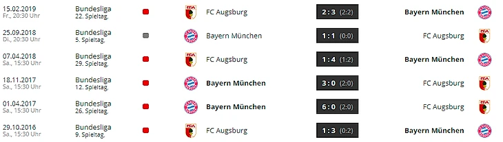 Обе победы «Аугсбурга» в Бундеслиге случились, когда «Бавария» уже обеспечила себе чемпионство (в апреле 2014 года и в мае 2015) и заканчились со счётом 1:0.