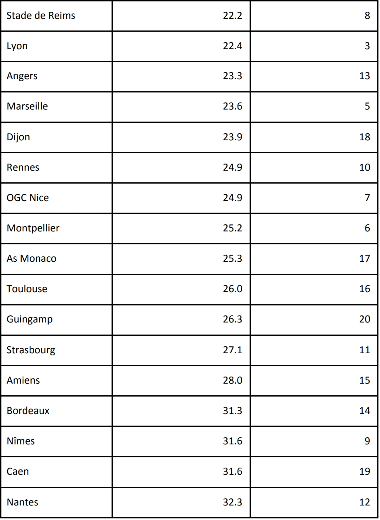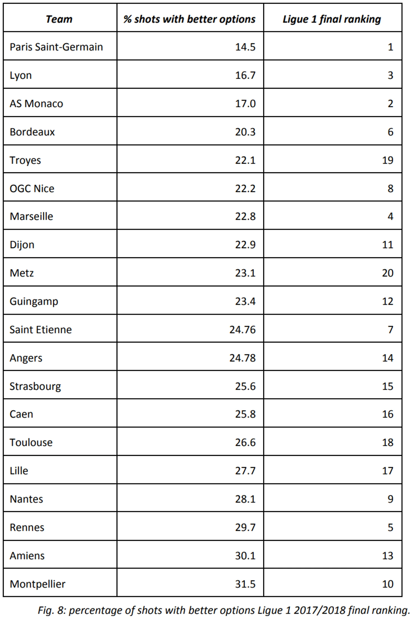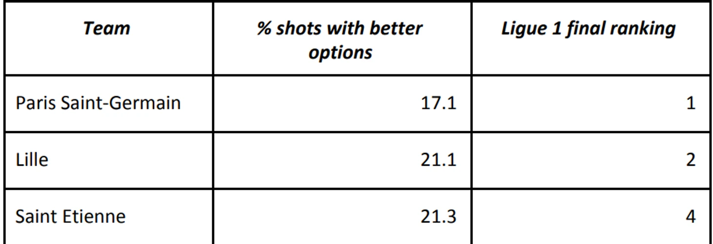 Чтобы показать более наглядно, мы смотрим на процент ударов с лучшими опциями в разрезе команды. Задаем вопрос о соотношении ударов с наличием лучших опций (меньше плохих решений на команду) с финальными позициями команд в Французской Лиге 1. В следующих двух таблицах даем ответ на этот вопрос, рассматривая процент плохих ударов и финальную позицию каждого клуба по сезонам 2017/18 и 2018/19.