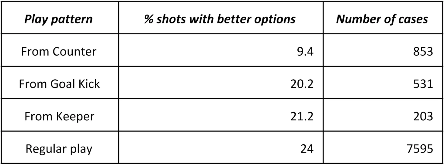 Сначала мы посмотрим на процент ударов, где была как минимум одна более выгодная опция по значению xG. Это показано ниже: