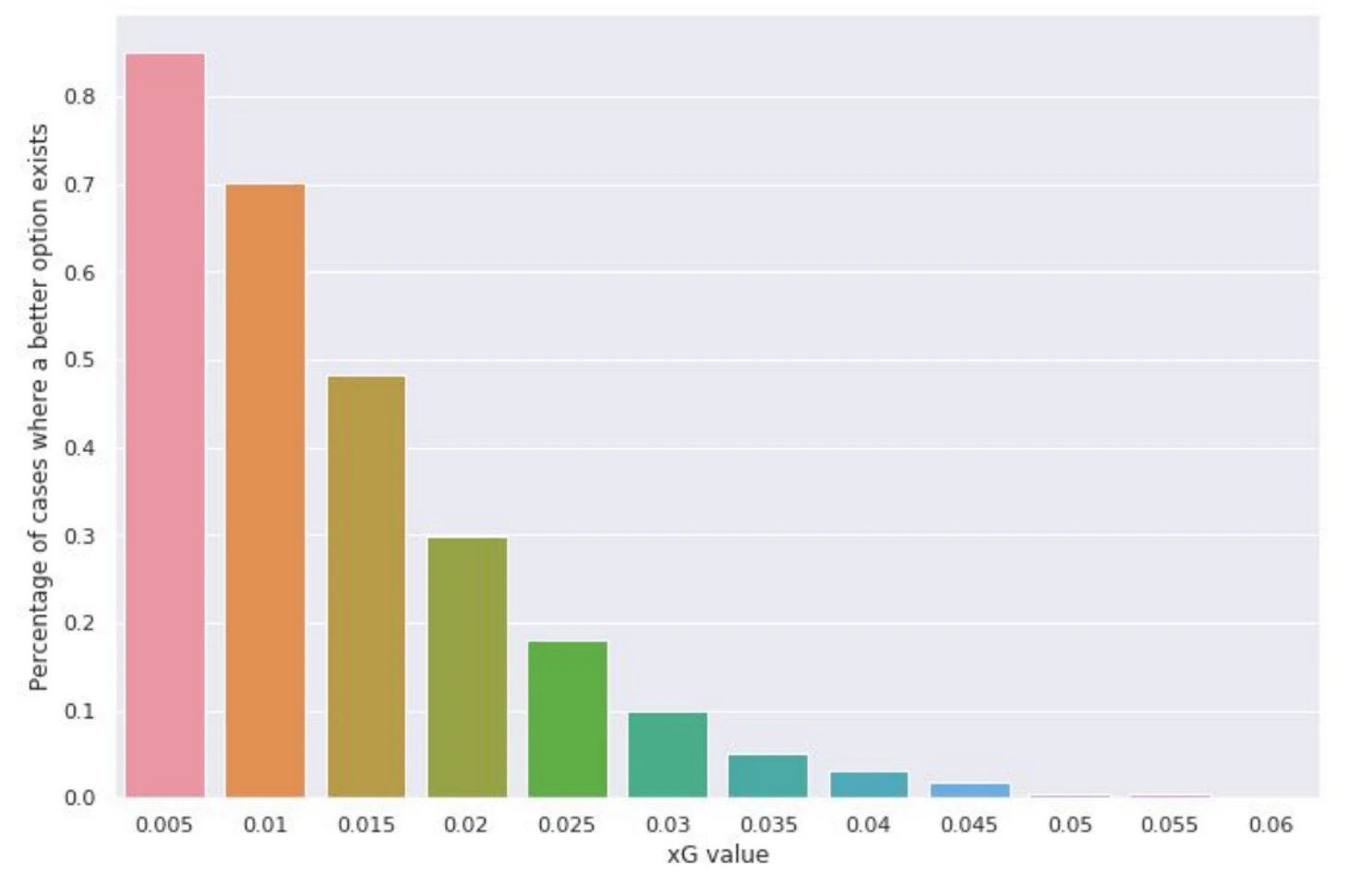 Мы четко видим, что процент ударов при более выгодных опциях растет тогда, когда падает значение xG. Таким образом, в дополнение к пониманию того, что удар был плохим решением ( если значение xG очень маленькое, бьющий должен был сделать что-то другое), мы знаем о наличии как минимум одной более выгодной опции. Мы показываем только небольшое значение xG на таблице, так как лучшие варианты становятся все более и более редкими, но объем ударов с небольшим xG в любом случае достаточно велик.