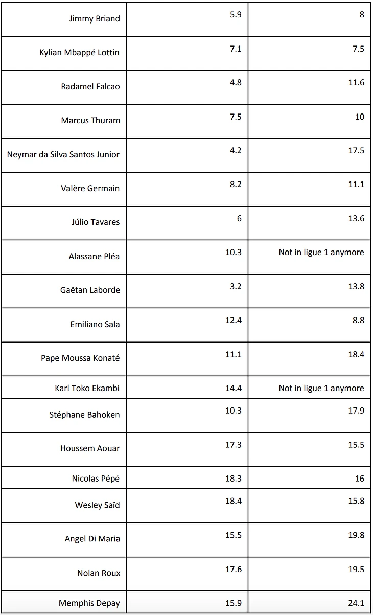 Мы можем увидеть, что некоторые игроки имеют практически идентичные проценты (Кавани, Мбаппе), некоторые идут на спад (Фалькао, Неймар, Таварес, Лаборд, Конате), а другие улучшают свои показатели (Ауар, Пепе, Саид). Это не говорит нам о том, что происходит, но это стартовая точка изучения того, как игроки меняются в плане своих ударов.
