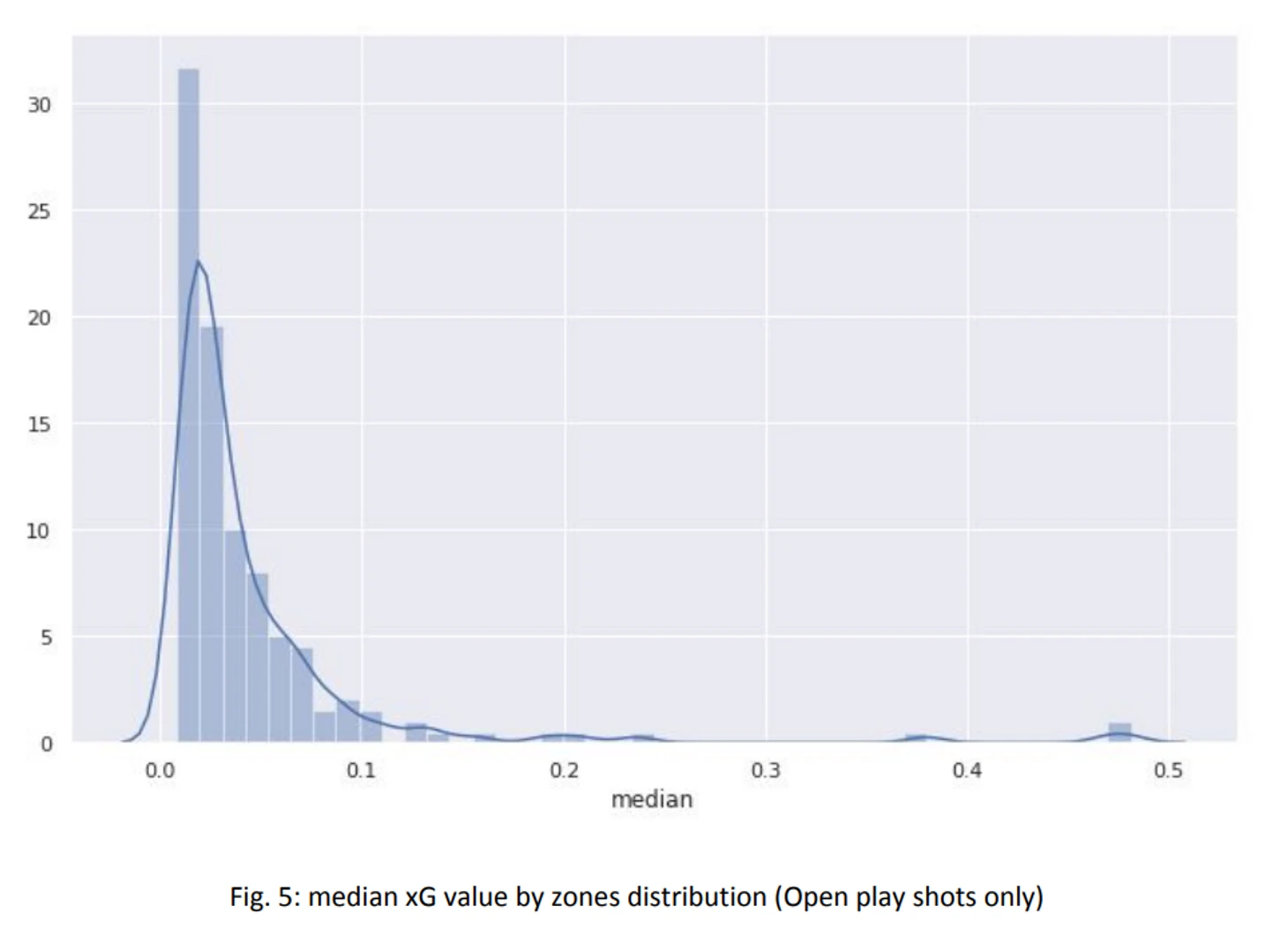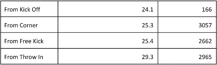 Чтобы быть способным сравнить реальный удар с гипотетическим ударом партнера мы должны иметь приблизительный xG каждого партнера, зависимо от его локации. Дело в том, что в Statsbomb информация о стоп-кадрах учитывается при расчете xG, поскольку она дает более точную модель. И, конечно, у них нет стоп-кадр данных для гипотетического удара, так что посчитать xG таким же способом невозможно. Тем не менее, возможно примерно подсчитать xG значение по локации, имея усредненные данные из похожих ударов. Мы выбрали поделить поле на зоны и подсчитать усреднения или медианы в каждой зоне. У нас есть данные только по двум сезонам, так что эта статистика могла бы быть более точной, но это достаточно хорошо для старта. Размер зон, которые мы берем: 5 на 5. Имея данные, которые у нас есть, это хороший компромисс между достаточным количеством ударов в каждой зоне и достаточно маленькими зонами. Вы можете увидеть распределение на следующей таблице. Более маленькие зоны могли бы дать большую точность, если бы у нас было больше данных.