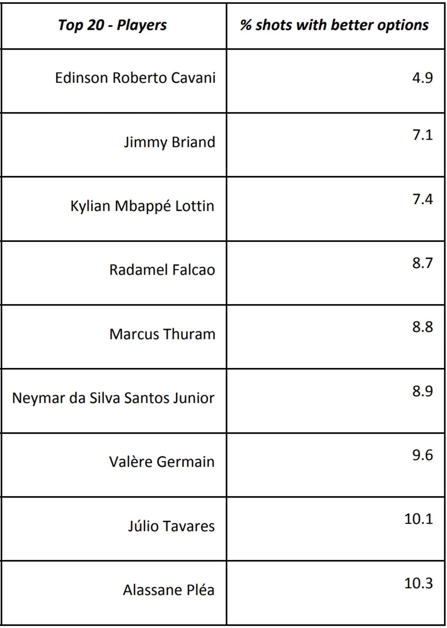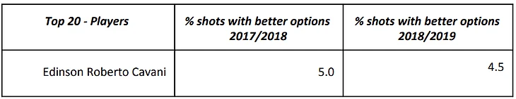Например, Эднисон Кавани имеет в своем пассиве очень мало плохих решений: всего 5% его ударов сопровождались возможными лучшими опциями. Так как Кавани наносит много ударов из центральных зон штрафной, возможно, что его удары имели большее значение xG (что и объясняет низкий процент лучших опций). Тем не менее, это дает определенное понимание об ударах и о том, как игроки ими распоряжаются.