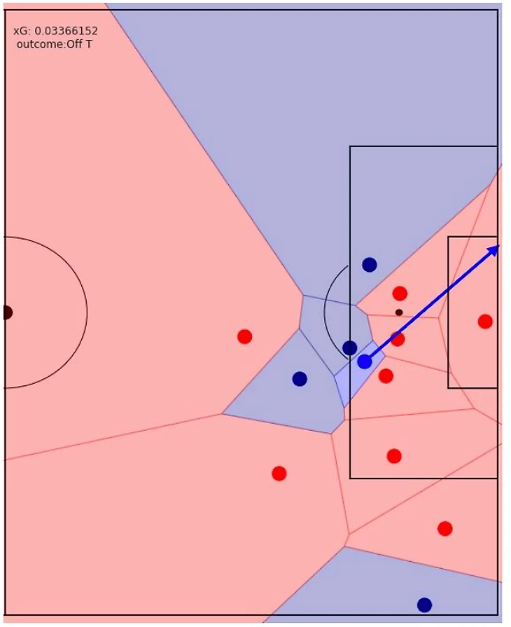 На следующей иллюстрации мы можем заметить, что у нас есть партнер на левой стороне штрафной, но его клетка Вороного не связана с бьющим, так что пас на этого конкретного игрока будет проигнорирована моделью.